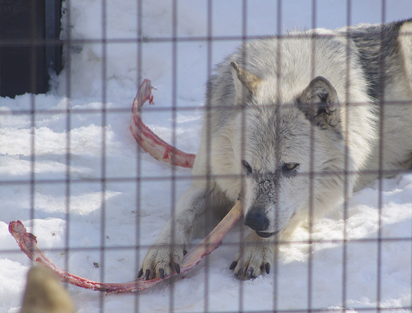 スポンサーリンク 円山オオカミず 221 2011.02.23 好天が続き、放飼場内の雪が、じわじわと溶けて締まってきました。 ふわふわ雪で遊ぶことは、今年はもうない? これからは、湿った雪が多いかもしれません。 少し肉がついている骨を、何本がもらったようで、 裏マスで、一生懸命食べていたキナコとルークでした。
