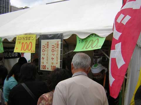 スポンサーリンク 札幌大通ふるさと市場 vol.2 2005.09.03 かかしのふるさと共和町。メロンやスイカ、お米の産地で有名です。 そこで穫れたじゃがいもで作ったコロッケ(1個100円)です。 揚げたてで、じゃがいもがほくほくで、これまたおいしい! これから、じゃがいもがおいしくなる季節です。