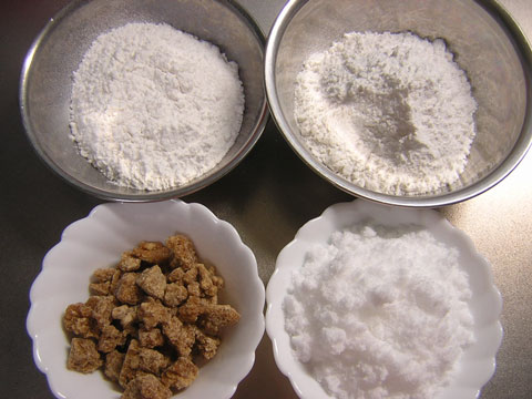 1.それぞれの分量の砂糖と水を鍋に入れ、火にかけ溶かし、それぞれの粉の中に少しずつ入れて、粉と合わせる。(熱いので注意)