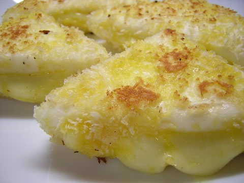 真ん中に切り込みを入れて、とろけるチーズを入れ、小麦粉、卵、パン粉をつけて焼きました。