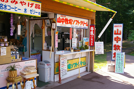 公園内に並ぶ売店の一店にある、山中牧場の牛乳ソフトクリーム。