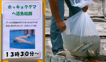 もうすっかり恒例行事となりました、「ホッキョクグマの活魚給餌」。
