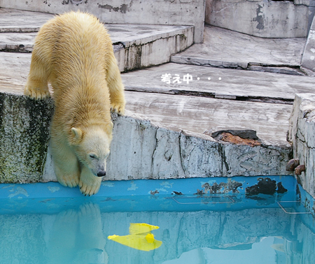 プールに落ちたおもちゃを取るのを諦めた、マー。