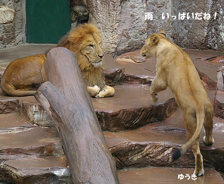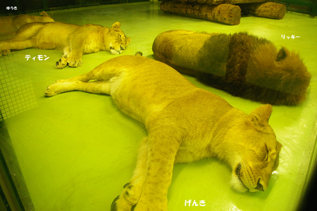 屋根のある所のそばで、固まって寝ていたライオン一家。