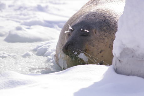 ゴマフアザラシ(キカナイ/メス)が、前ヒレを使って、氷を削り、穴を広げているところ。
