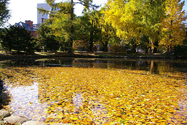 池が落ち葉で黄金色の鏡みたいになっているなんて・・
