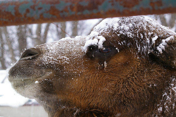 長い毛足が羨ましいラクダですが、雪がこびりついてしまいますね。