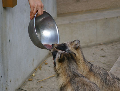 肉汁にだって、どん欲です。さすが雑食のエゾタヌキ。