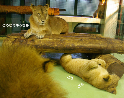 屋外へ入り、餌を食べた後は、やっぱりごろごろするライオン一家。