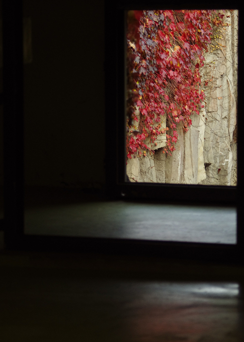 トラ舎の屋内から覗き見た、ツタの葉の紅葉。