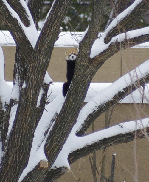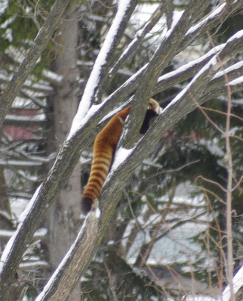 職員さんたちが、見守る中、レッサーパンダが登っていきます。