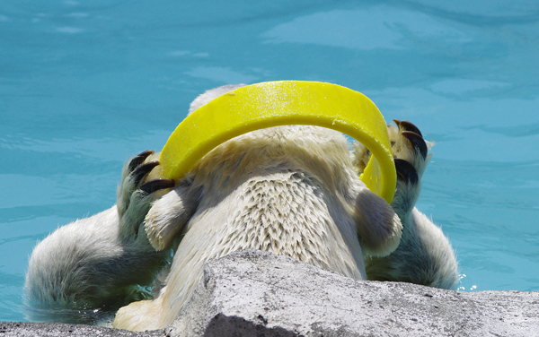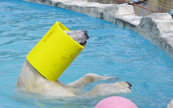 11時からはホッキョクグマガイドで、ホッケ、リンゴ、ブドウの入った浮き球をもらいました。