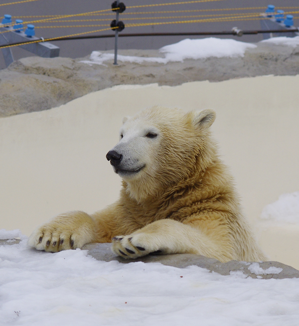 つるつる氷の上でじゃれあうポロロ(左)とマルル(右)。
