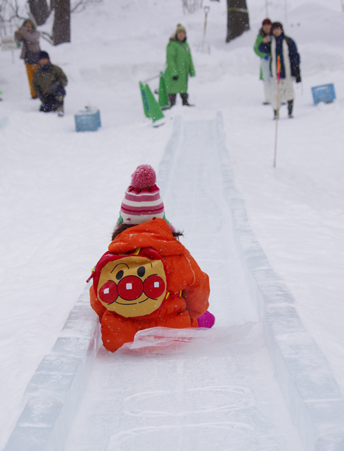 レストハウス前に作られた、氷のすべり台。
