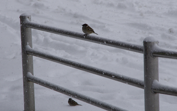 この吹雪じゃ、飛ぶのも大変そうなので、風の当たらない場所にいるようでした。