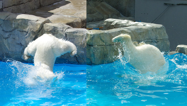 飛び込んでいる親子の後ろ足。(左こぐま、右ララ)