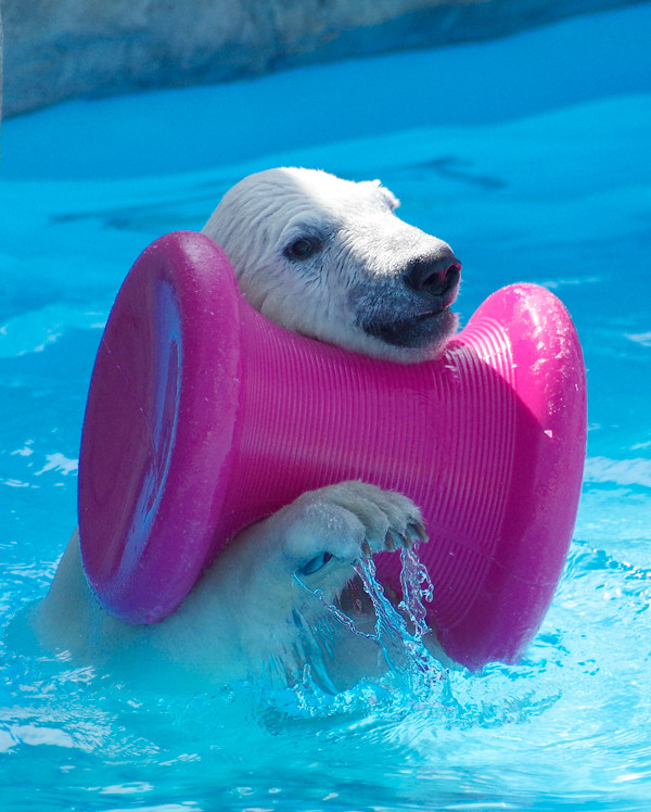プールのおもちゃが少ないせいか、檻のマスからおもちゃを運んできたこぐま。