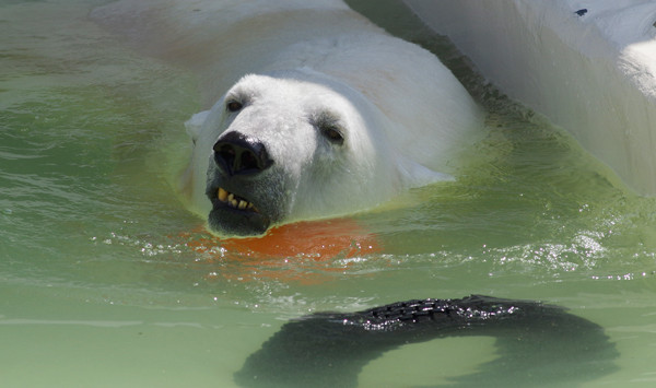 担当さんのガイド中、寝室の檻から覗き見ているこぐま。
