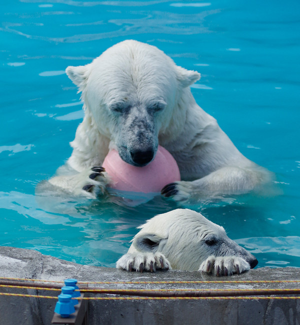 親子が寝室で寝ている間、デナリはプールに入って遊んでいました。