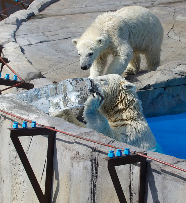 夜の動物園で行われたイベント「氷像彫刻パフォーマンス」で作られた作品を、ホッキョクグマに頂けることになり、