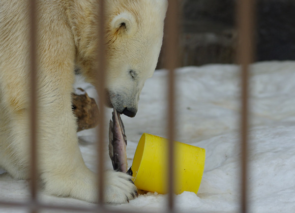 新しいおもちゃ、黄色いミニガス管の中に、魚を入れたり出したりして、