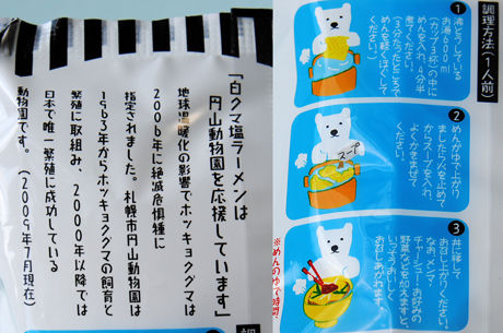 袋の裏面には、白クマが、ラーメンを作り方を説明。