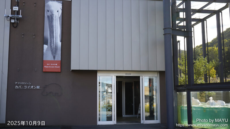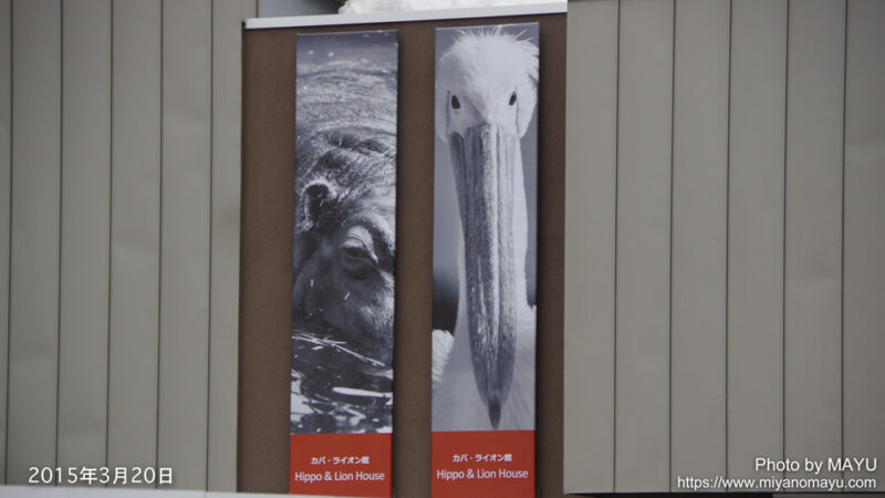 カバ・ライオン館のカバ舎・ペリカン舎側には、カバのザンとモモイロペリカンの写真がイメージとして採用。