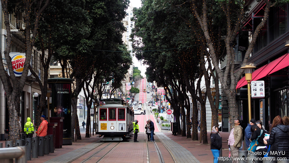 サンフランシスコといえばケーブルカーのイメージ。普段より重いスーツケースを運びながら、この坂道を登っていくのは、ちょっとしんどいですが、歩いて登って先にホテルにチェックインします。