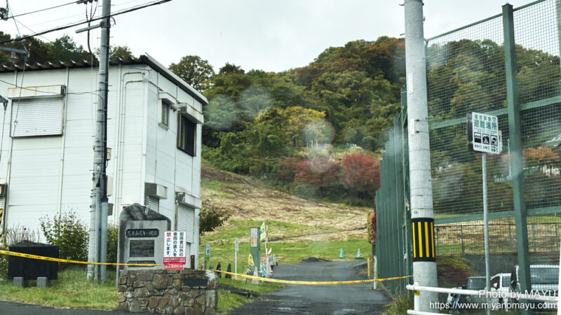 規制線が張られた荒井山緑地の風景は非常に珍しく、物々しく感じます。