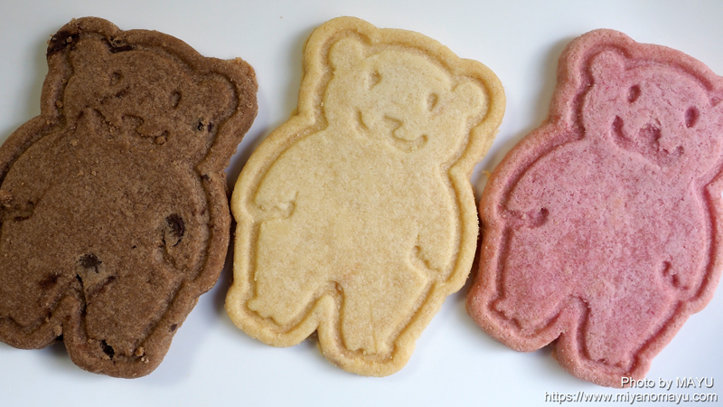 イギリスといえば、ショートブレッドを思い出しますが、食感はそのショートブレッドのように、サクサクほどけ、それぞれチョコレート、ホワイトチョコ、ラズベリーの風味が加わった感じ。クマ型の厚みが食べやすくて、おいしいです。イギリス訪問時に、本場で見つけたかったのですが、出会えず残念でした。