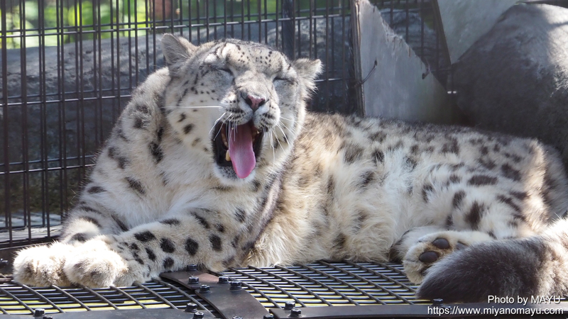 暑さが苦手な動物には大変な一日だったと思います。ユキヒョウのユーリは日陰に入って、開口して呼吸。