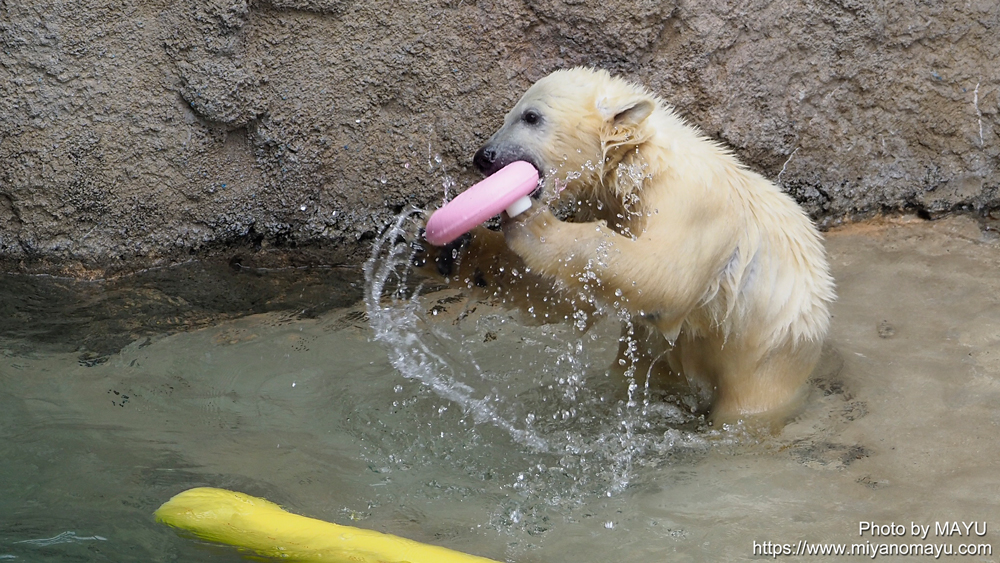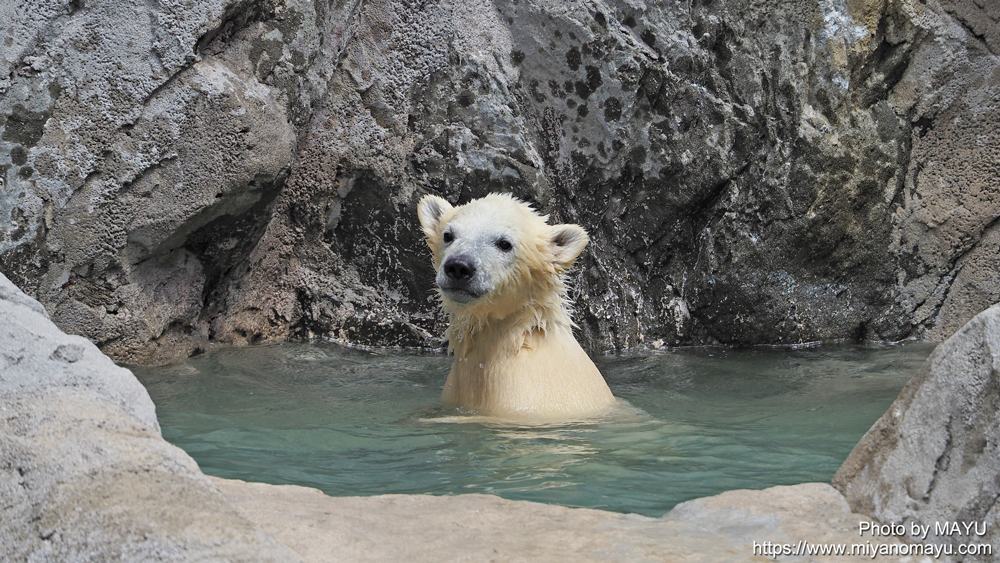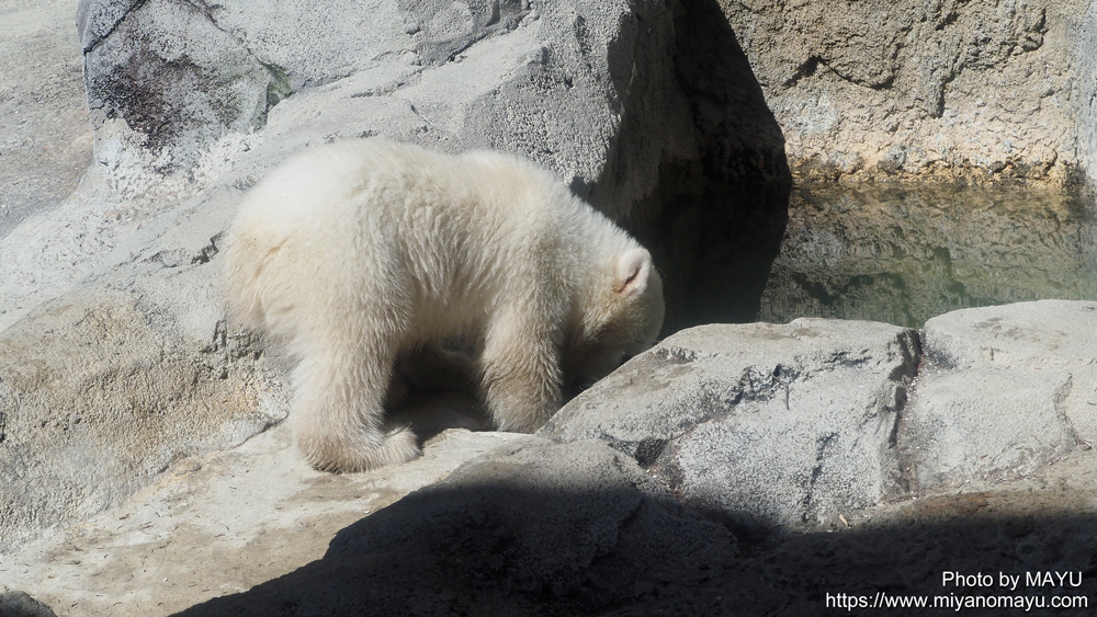 9時30分の開園後真っ先にほっきょくぐま館へ向かうと、ピリカが放飼場の中央で用を足し、こぐまは滝壺プールで弾けている最中でした。おそらく、朝ごはんを食べた後なのでしょう。