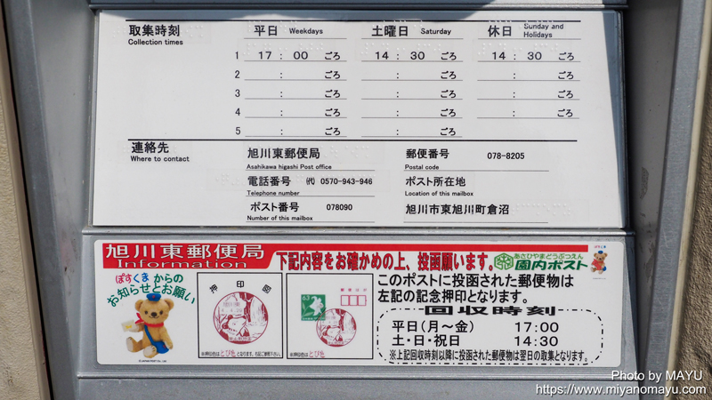 旭山動物園内の中腹あたり、ほっきょくぐま館とあざらし館の間にある売店の前にある、ペンギンポストに投函すると、その年の小型印を消印として押印されます。