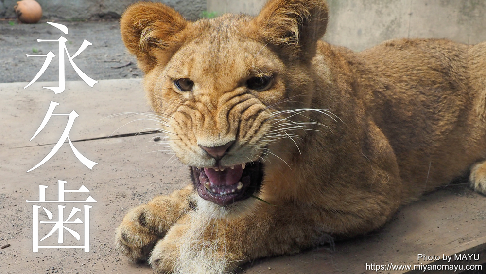 2023年7月14日(金)に訪問した旭山動物園ライオン家族の記録です。先月は少し見えていた犬歯の永久歯の先が、少し伸びてきているのが見えました。口を開ければ、まだまだ可愛らしい歯ですね。