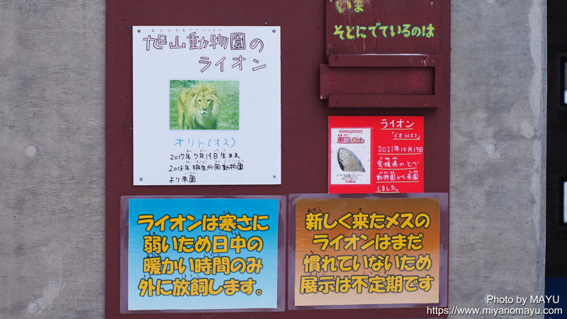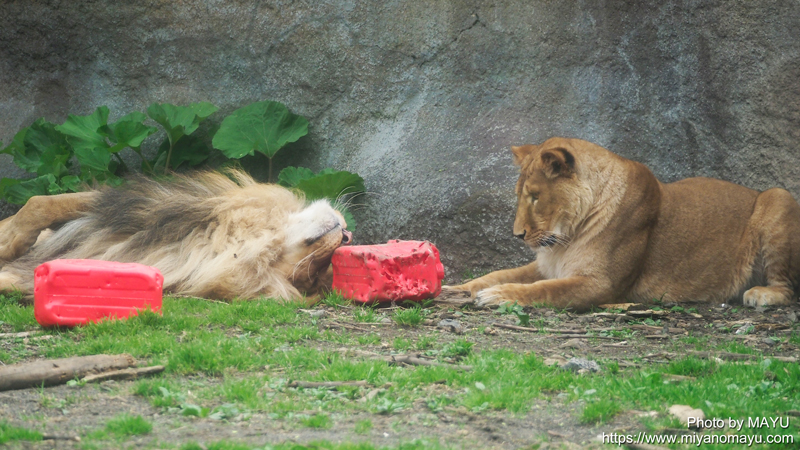 旭山動物園のライオン、オリト(オス/4歳)とイオ(メス/1歳)です。オリトは2018年8月7日に桐生が岡動物園(群馬県)から来園し、イオは2021年10月20日にとべ動物園(愛媛県)から来園したばかりの個体。寒い時期は別々で暮らし、そろそろイオも旭山の環境に慣れてきたと思われるこの春、休園期間中から、屋外同居が始められました。