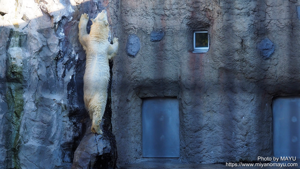 隣の放飼場(カプセル側)に、今日は午後から登場していたルル(メス/28歳)は、ララと双子の姉妹。11月20日が誕生日なので、早めのおめでとうを言ってきました。写真はプールから上がった直後、壁にスリスリしているルルです。