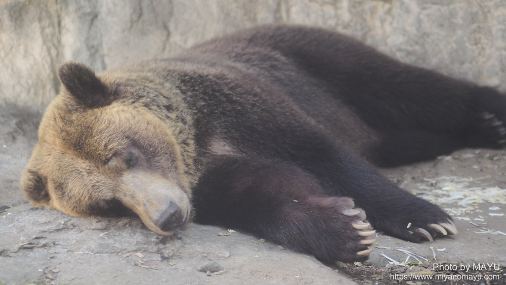 写真は円山動物園のエゾヒグマ、とわ(メス/18歳)。昼寝をしている最中です。この冬、とわは冬眠をしなかったので、通常展示が継続中。オスのダイと半日交替で屋外に出ています。