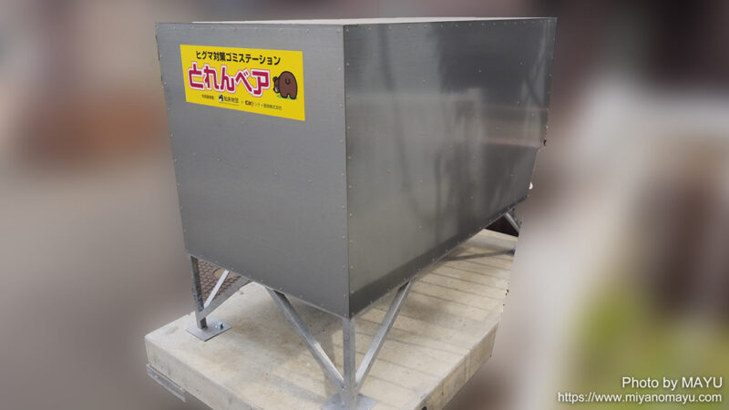 分厚いコンクリートに取り付けられたゴミ用の箱です。ステンレス製で重さは1トン程とのこと。実際に動物園のエゾヒグマ舎に設置しても、壊されなかったそうです。