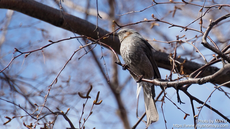 ヒヨドリは必ず毎日出会える野鳥。シラカバの枝に留まっています。