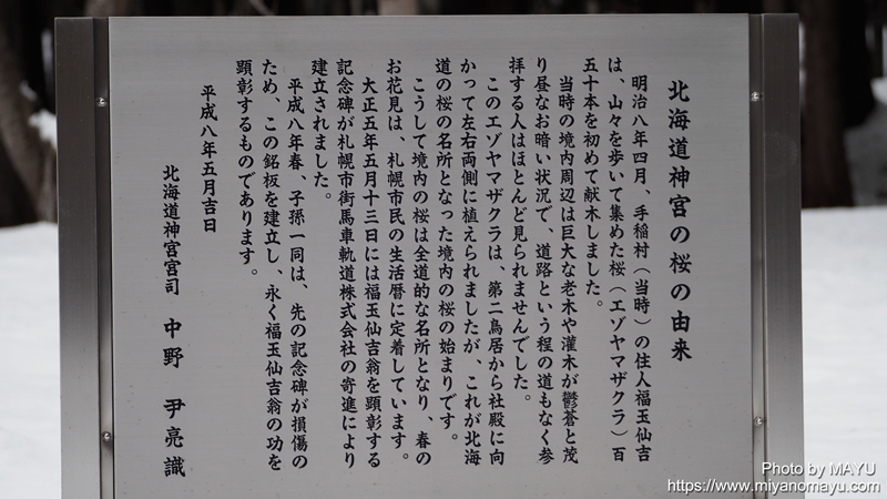 北海道神宮境内の桜も、札幌の桜の名所のひとつとなっていますが、その由来が、前標本木近くに建てられています。今から145年前、1875年(明治8年)4月に、当時の手稲村の福玉仙吉氏が、山々を歩いて集めたエゾヤマザクラを150本献木したのが始まりだそうです。145年の歴史を感じつつ、今年も神宮の桜を見に行けたらいいなあと思っていたのですが、札幌市内の新型コロナウイルスの感染拡大が、なかなか厳しい現状となっており、今年は見送らざるを得ないです。