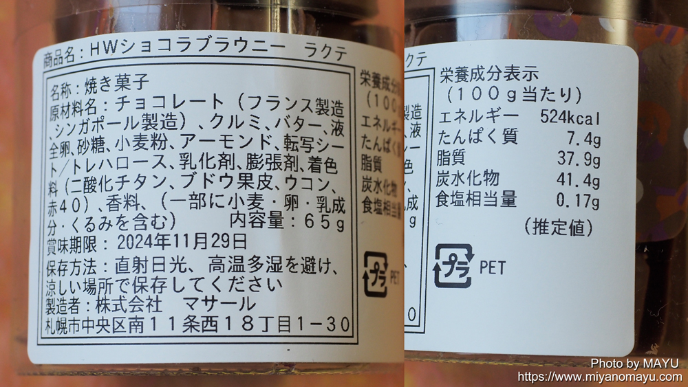 ハロウィンショコラブラウニー「ラクテ」の原材料名と栄養成分表示。