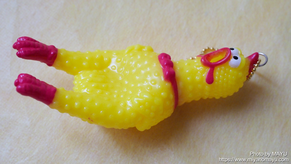 お腹のあたりを押すと音が出ます。ポリ塩化ビニル製のおもちゃ。改めて見ると鳥肌が妙にリアルなのです。ボールチェーン付きなので、どこかに付けられます。ボールチェーンはやや細めなので、カバンにぶら下げていたら失くしそうな予感がします。