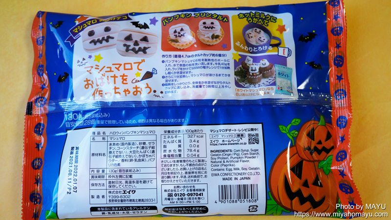 ちなみに中にジャムやゼリーなどは入っておらず、マシュマロ全体がかぼちゃ風味になっています。100gあたり 327kcal。