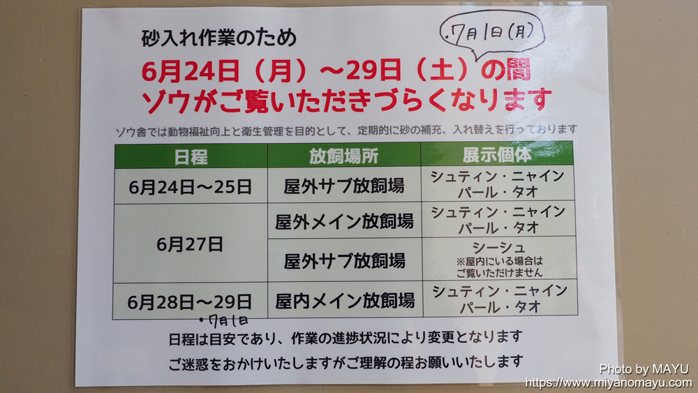 ゾウ舎の屋内・屋外放飼場にはたっぷりの砂が敷き詰められています。毎日の清掃などで少しずつ減ったり、糞尿などで踏み固められたりする砂を、定期的に入れ替えされていますが、一度にゾウ舎全ての場所の入れ替えは出来ないため、順次場所を変えて、各所の砂入れが行われています。
