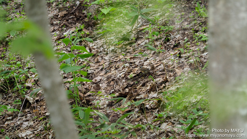 スポンサーリンク マミチャジナイ 枯れ葉をめくって餌探し 2020.05.26 ユニークな響きで、名前だけは知っていましたが、見るのは初めてでした。林の中に、群れでやってきたマミチャジナイたち。見た目も少し似ていますが、ツグミの仲間。 雪解け後の林の中はこんな感じ。落ち葉が層になっています。ガサッ、ガサッという音が聞こえ、小動物がいるのかな?と思ったらミチャジナイたちでした。音がしなければ、まったく気づかない保護色。 赤丸の中にマミチャジナイがいます。 枯れ葉の層をめくり下にある餌を探しているようです。めくって移動、めくって移動を繰り返す群れ。 見つけづらい所にいます。 地面を背景にしたマミチャジナイは、わかりづらいので、枝に留まった瞬間を狙います。 またどこかで会えますように。