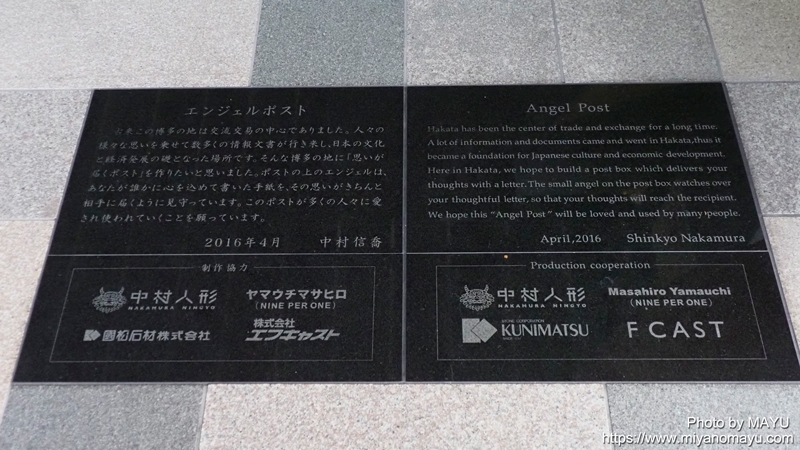 このエンジェルポストは、すぐ前にあるKITTE博多という商業施設のOPENに合わせて2016年4月に設置されたもの。思いが届くポストがコンセプトの中村信喬氏の作品だそうです。