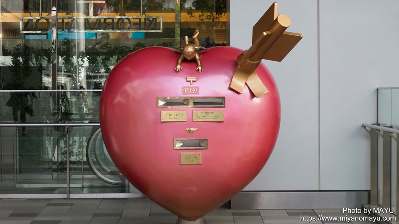 九州旅行中のこと。博多駅の広さに圧倒されながら、表示を頼りにあっちへこっちへ目指すポイントへ向かいます。のんびり気ままな旅ならいいのですが、いつも詰め込み過ぎ傾向なので、慣れない地での乗り換えには多少緊張しています。乗り換え時間が短い中、博多駅で見たかったのが、このエンジェルポスト。ハートに矢が刺さり、天使も乗っかってます。そしてサイズも大きいのです。こども用投函口もあります。ここで投函すれば、なんとなくいい予感です。(投函しませんでしたが(^_^;))