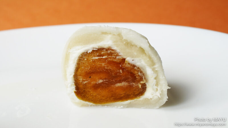 求肥の内側は白あん、その中にホイップクリームに包まれたあんぽ柿がまるごと1つ。