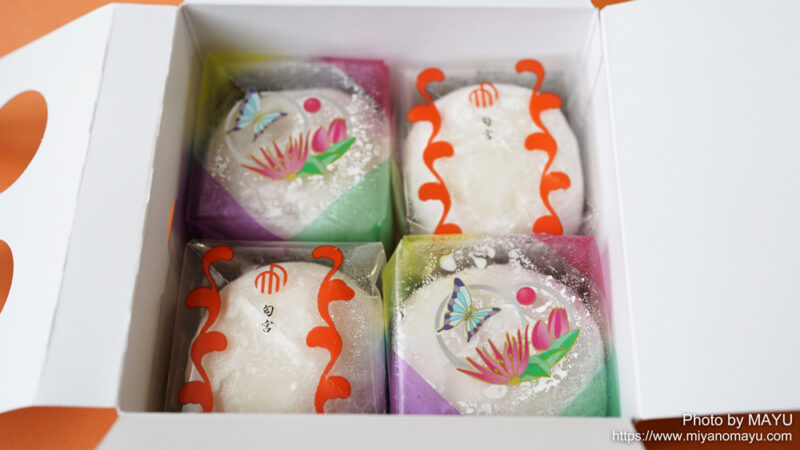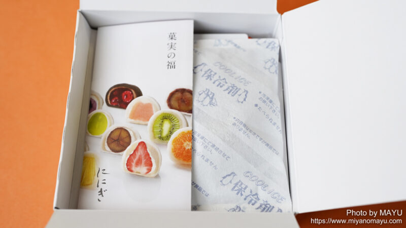 しおりと保冷剤とともに、白い小箱に4つ詰めてもらいました。