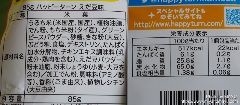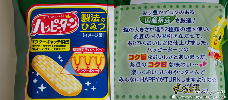 スポンサーリンク 期間限定発売 ハッピーターン えだ豆味 2020.03.20 2020年3月2日から限定発売が始まった、ハッピーターンのえだ豆味。2016年から期間限定で発売されていたそうですが、今年初めて気づきました。ハッピーターンもいろいろな種類が登場しますね。 国産茶豆のパウダーが使われているそう。 袋を開けると、枝豆の香りがふわ〜っと広がりました。中には個包装されたハッピーターンが22枚。 黄緑色の枝豆パウダーをまとった、ハッピーターン。豆っぽい風味が鼻から抜けて、あと引きますね。 1個あたり22kcal。 北海道でもハッピーターン味のメロンパンパンコーナーで、あのハッピーターンのパッケージが並んでいたので、思わず目が留まりました。フジパンのサイトでは、ハッピーターン味のメロンパンが、9月1日に北海道・沖縄を除く全国で新発... 北海道限定 ハッピーターン 夕張メロンご当地もののお菓子は、いろいろありますが、意外に地元のお菓子を知らなかったりします。北海道限定のハッピーターンは、夕張メロン味 でした! ハッピーターンアイス9月29日(月)、明治と亀田製菓のコラボ商品、ハッピーターンアイスが新発売されました。スーパーで見つけ、早速購入。パッケージは、ハッピーターンそのものです。(1個 102円) ひんやりハッピーターン亀田製菓の新商品、ひんやりハッピーターンの発売記念のイベントに参加したのなら、やっぱり食べてみたい「ひんやりハッピーターン」。6月18日から、100g入りタイプが、全国のスーパーな... 期間限定発売 ハッピーターン 焼きいも味2020年9月7日から期間限定で発売されているハッピーターンは焼きいも味。春に期間限定でハッピーターンえだ豆味が発売されていましたが、秋からは焼きいも味ですね。今回は、パッケージの...
